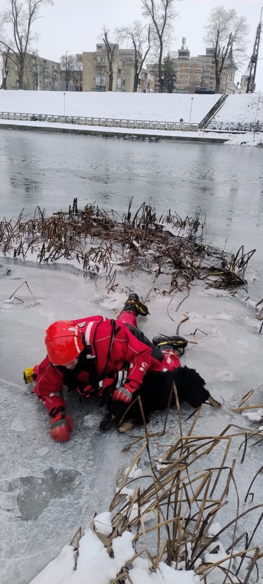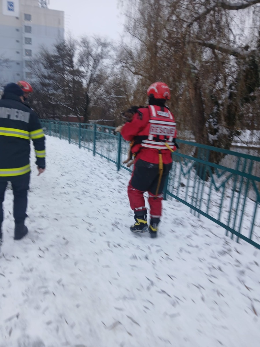 La faţa locului au ajuns imediat pompierii Detaşamentului 1 Oradea, care, echipaţi corespunzător şi folosind tehnici specifice unor astfel de intervenţii, s-au deplasat pe suprafaţa gheţii până la locul incidentului, au evacuat câinele din apă şi l-au adus în siguranţă la mal.