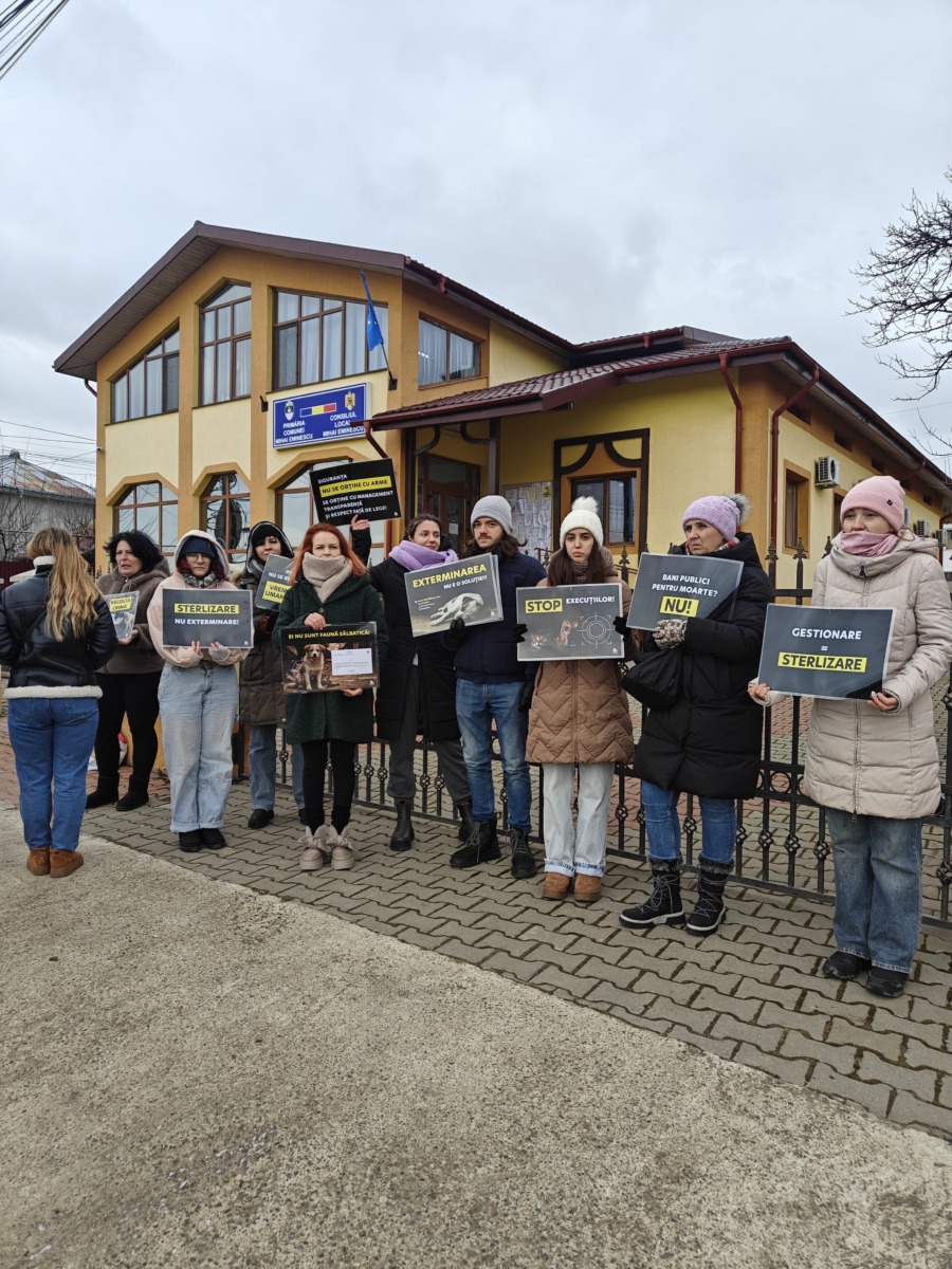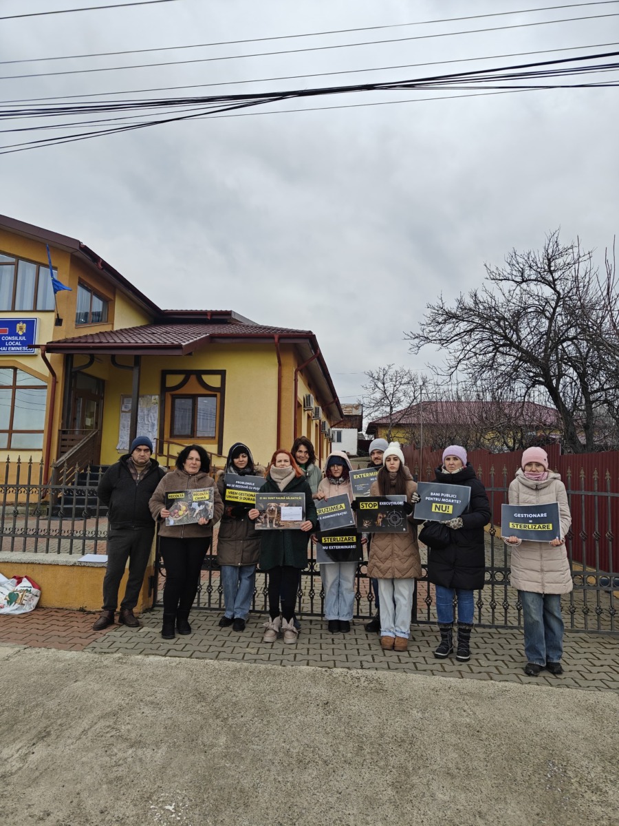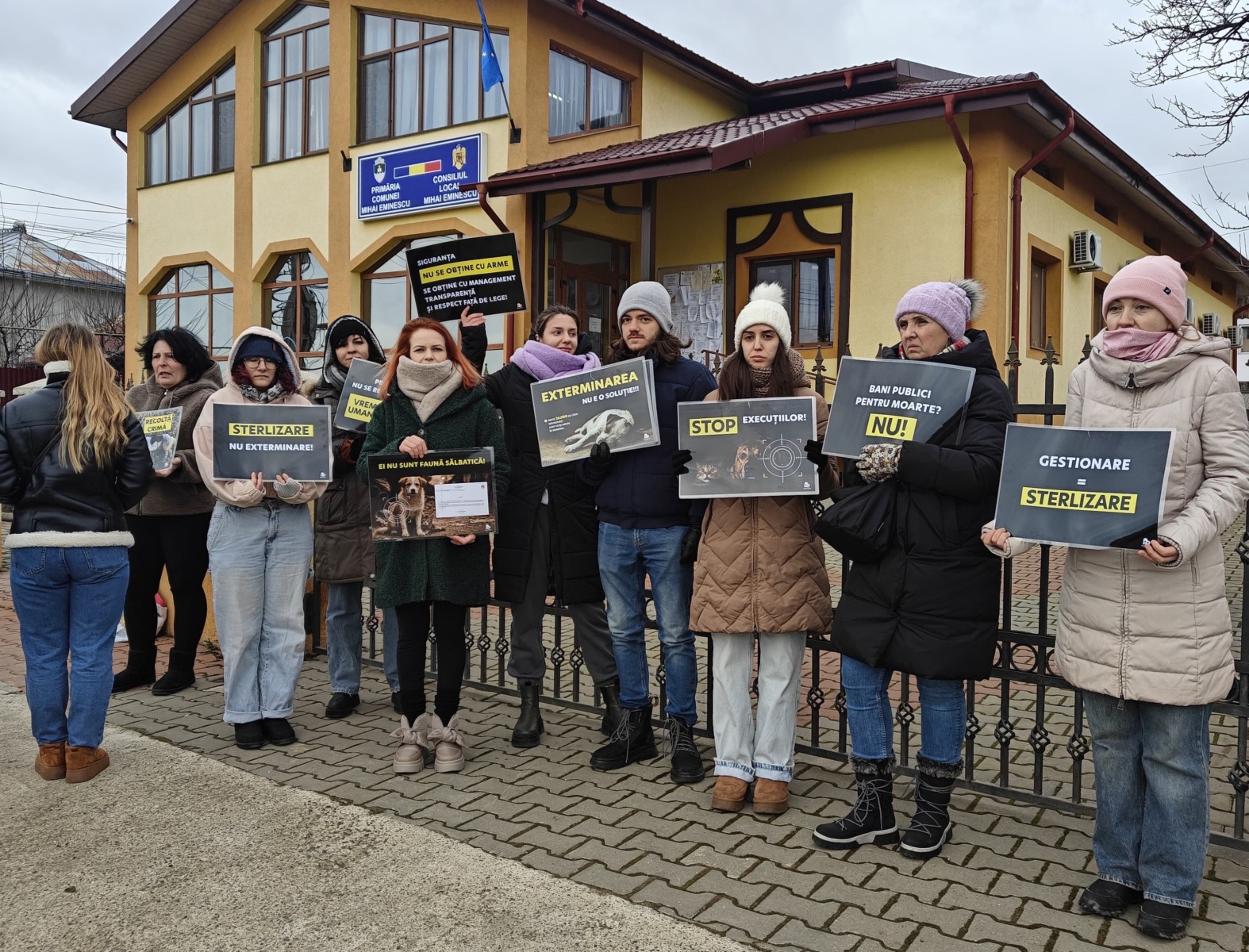 Mai mulți iubitori de animale și activiști pentru drepturile acestora s-au strâns, în dimineața zilei de astăzi, în fața Primăriei din comuna Mihai Eminescu, pentru a protesta împotriva vânătorii anunțate de autorități pentru zilele de 29 și 30 decembrie.