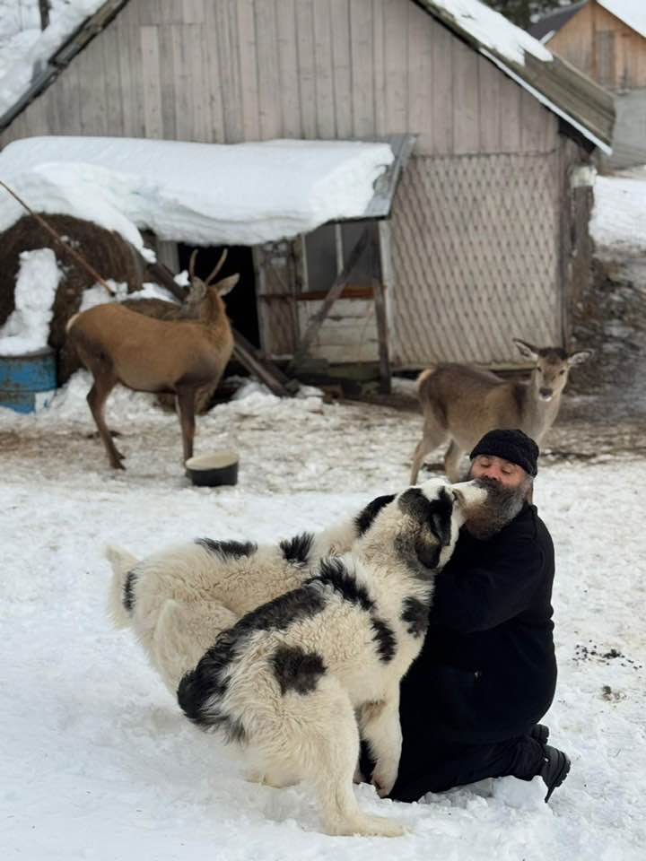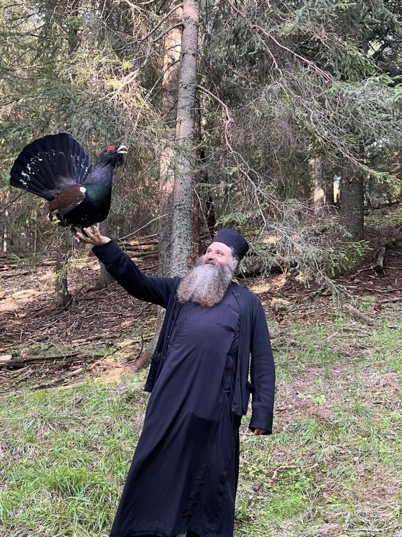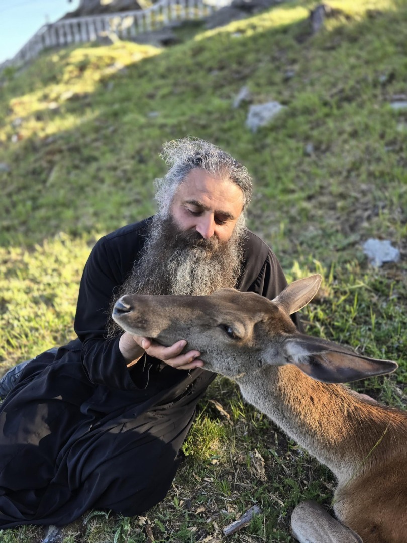 Părintele Macarie Olărean: La mănăstire vin multe animale — de toate felurile. De la cele mici, cum sunt iepurii, aricii, vulpile, până la cele mari: căprioare, cerbi, mistreți, lupi, chiar și urși — care, în mod firesc, ar fi trebuit să fugă de om sau să se ferească. Dar aici, în locul acesta binecuvântat, ele nu se tem. Nu atacă. Nu tulbură. Unele dintre animalele pe care le-ați văzut pe internet și care apar des în preajma mănăstirii au fost salvate de noi din nevoi grele, le-am ocrotit, le-am hrănit — și acum vin mereu, nu din obișnuință, ci ca o formă de recunoștință. Dar dincolo de acestea, animalele care trăiesc în zona mănăstirii nu mai sunt sălbatice, cum sunt cele din adâncul pădurii. E o blândețe care le cuprinde. O pace care le schimbă firea. Și pot spune cu mâna pe inimă: nici lupul, nici ursul nu ne-au făcut vreodată rău. Și să știți că în împrejurimi, la stâni, se întâmplă nenorociri — frecvent, din păcate. Ursul dă târcoale, rupe garduri, sperie oamenii și chiar ucide vite și oi. Acum vreo doi sau trei ani au fost și victime omenești.