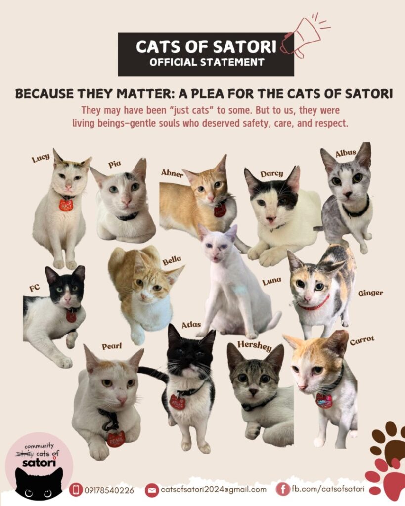 Grupul de iubitori de animale „Cats of Satori”, format din locatarii complexului Satori Residences din Pasig, a tras un semnal de alarmă după ce, în perioada ianuarie–iunie a acestui an, mai multe pisici au dispărut fără urmă. Printre felinele date dispărute se numără Lucy, Pia, Abner, Darcy, Albus, FC, Bella, Luna, Ginger, Pearl, Atlas, Hershey și Carrot, notează One news.