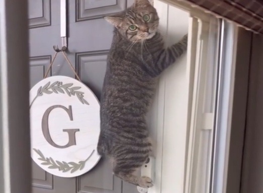 Cum se desfășoară operațiunea? Ei bine, pisica, vizibil antrenată și cu experiență în astfel de „misiuni”, s-a cocoțat pe tocul ușii de la intrare, s-a agățat cu lăbuțele din față, iar cu una din cele din spate… a apăsat soneria! Și ca treaba să fie completă, s-a uitat pe geam, direct spre stăpânul care o filma de la fereastră, de parcă voia să verifice dacă a fost observată.
