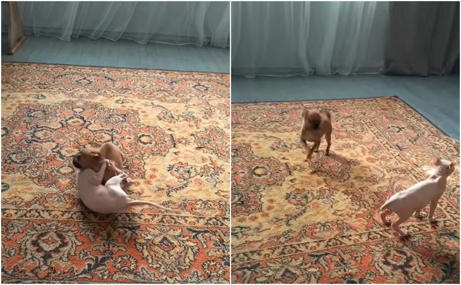 Provocarea a fost deja lansată, dar pisica Sphynx nu a răspuns fizic, ci un calm și o privire pătrunzătoare, care parcă spunea „Hai, te aștept, dacă îndrăznești!”. Evident, oponentul canin a îndrăznit, iar confruntarea corp la corp a fost pe cât de interesantă, pe atât de amuzantă.