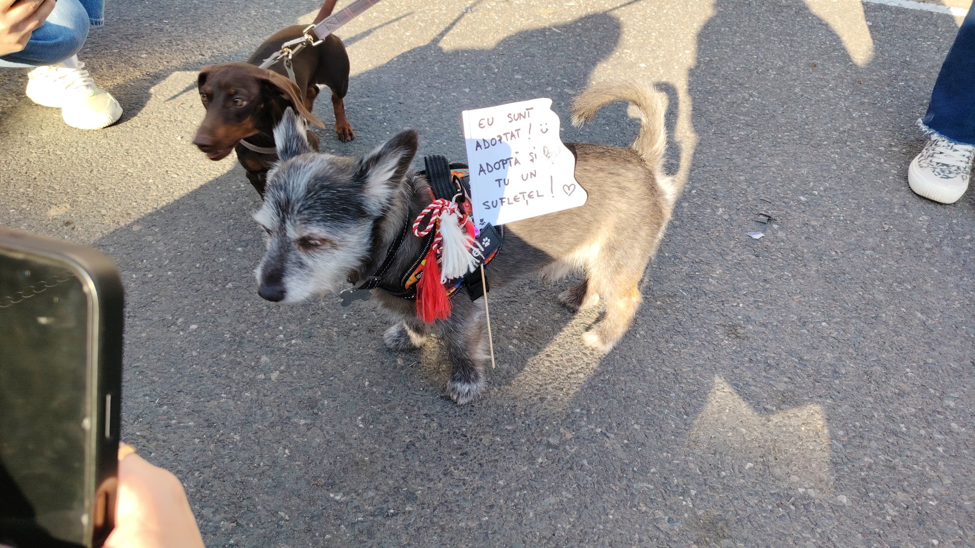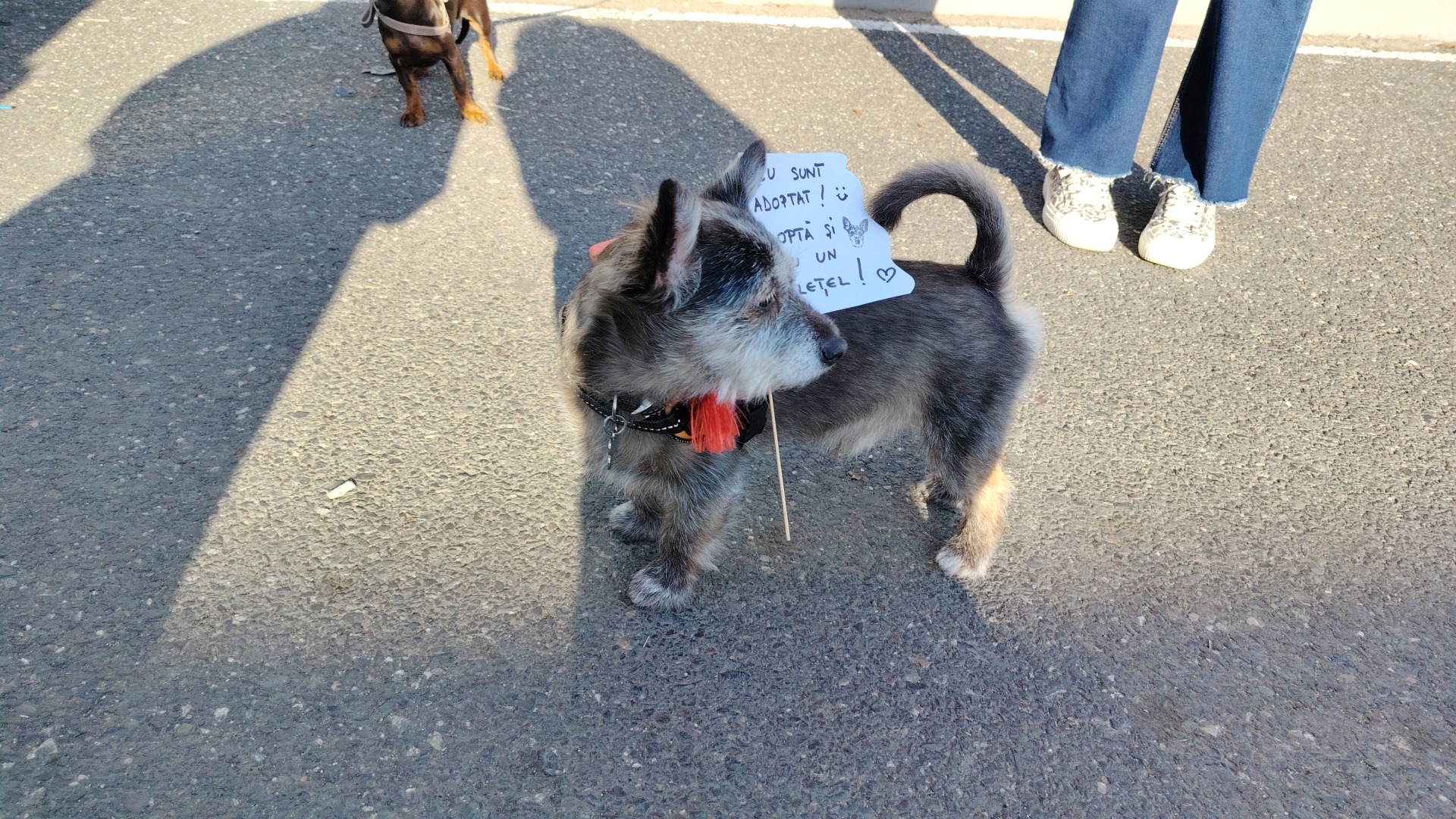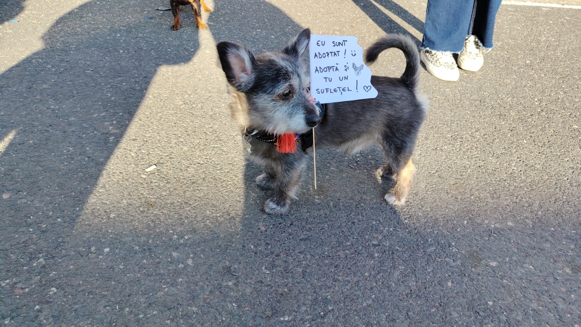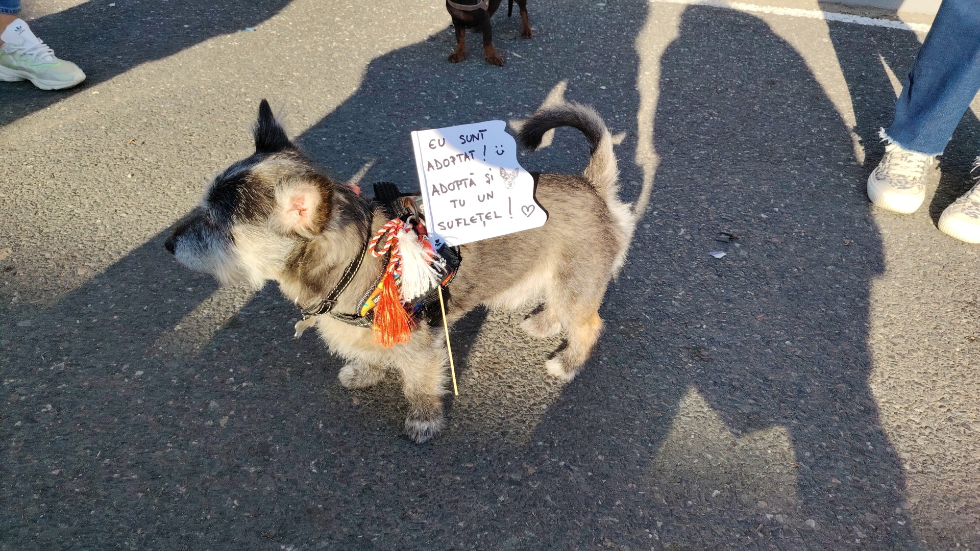 „Și eu sunt adoptat. Adoptă și tu un suflețel”, este mesajul discret, dar puternic, care a reușit să oprească din drum zeci de oameni pentru a-l mângâia și pentru a lăuda inițiativa.