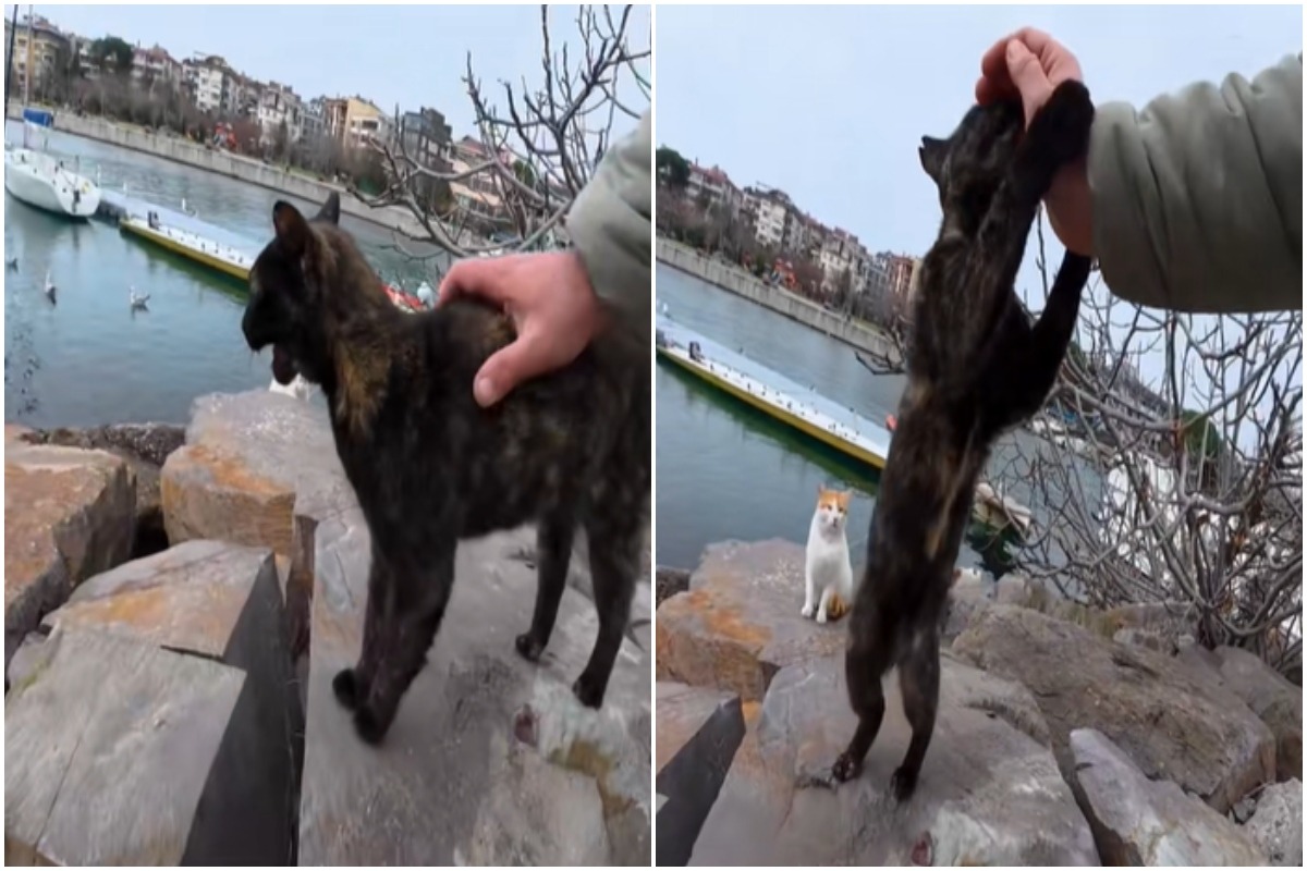 De cum s-a apropiat de turistul prietenos, pisica a început să ceară mângâieri în cea mai simpatică formă. A mieunat și a tors de parcă cerea, cu cuvinte reale, să fie iubită. Clipul arată cum motănelul se gudură pe lângă trecător și continuă să ceară afecțiune printr-o serie de mieunături adorabile.